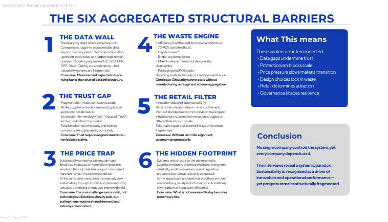 A comprehensive study mapping shared challenges and untapped opportunities across the entire eyewear value chain — grounded in research and in-depth interviews with 19 companies in the eyewear industry.